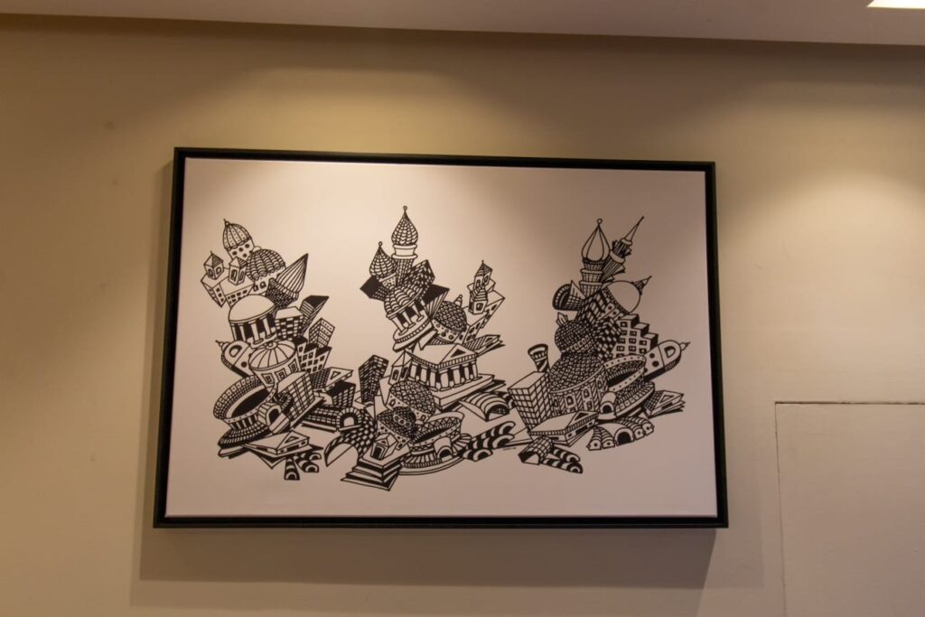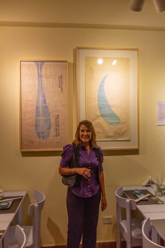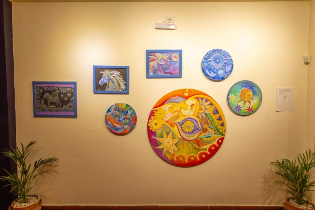 El recorrido artístico comienza en el ingreso con este espacio que celebra a Agó Páez Vilaró, reconocida artista uruguaya cuya obra forma parte de coleccionismo . Ella y su arte dan cuenta de la comunicación del hotel, presente en el logo de Vilaró. Sus mándalas, con ese trazo tan particular, ilustran el colorido espacio de la entrada, y también se reproducen en las etiquetas de los vinos uruguayos que serán foco de catas