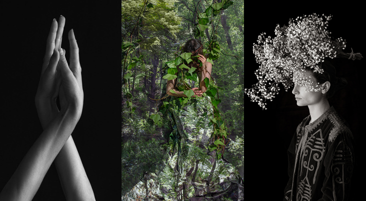 Gaston Bachelard decía que la casa es nuestro primer universo, el refugio donde arraigan la memoria y los sueños. Aquí, la naturaleza se presenta como esa casa primordial, un lugar de cobijo y pertenencia, casi como si fuera un templo sagrado. En estas imágenes, los cuerpos se repliegan en cuevas fantásticas, se conectan con las lineas de sinuosas ramas o se resguardan bajo arreglos florales, como si la propia naturaleza las envolviera en su abrazo. En este recorrido visual, la imagen se convierte en un umbral, una invitación a regresar a ese refugio esencial que nos habita.”